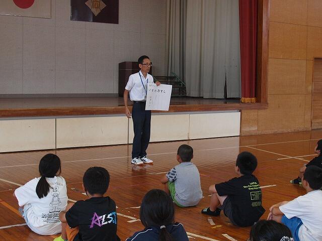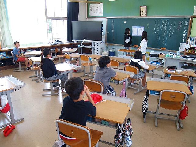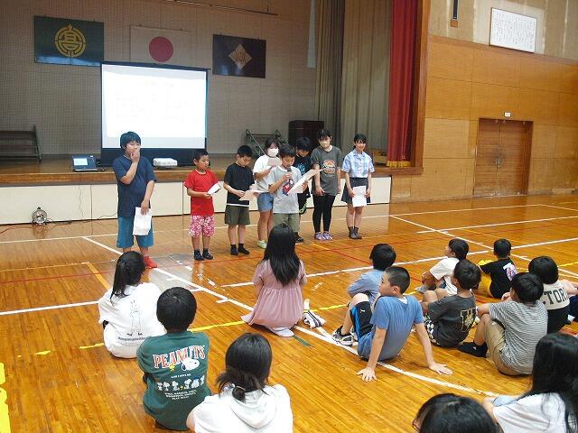 午後の終業式では、3年生と6年生児童による作文発表、1学期に頑張ってきたことの振り返り(講話)、校歌斉唱を行いました。その後、生徒指導担当の先生による「秋休みの生活の心得」についての話がありました。