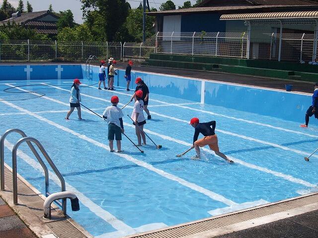 5月24日にプール掃除をしました。全校で、シャワーの床や、小プール、大プールの床のぬるぬるを、ブラシでこすってきれいにしました。しばらく使っていなかったのでひどいよごれでしたが、見違えるようにきれいになりました。