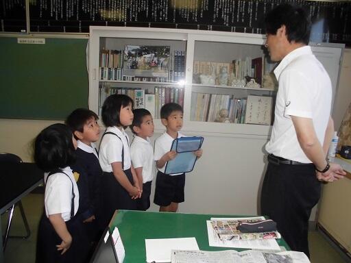 1年生は生活科の授業で学校探検に取り組みました。4~5人のグループで校内の様々な教室を探検します。「ここは何をするところですか?」「先生はどんな仕事をしていますか?」など、質問をしていきます。終わったら手持ちの校内図にサインをしてもらっていました。1年生にとっては、1年教室以外は未知の世界、みんな興味津々な表情で学習に取り組んでいました。