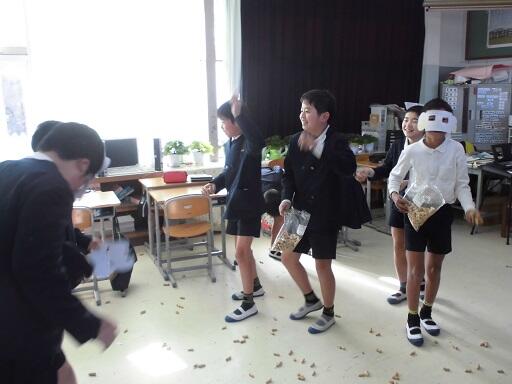 今日は節分です。本校でも全ての学級で豆まきが行われました。自分の中にいる退治したい鬼(例えば「忘れ物する鬼」「勇気が無い鬼」等)に、豆をあてて退治しました。自ら進んで鬼役になり、退治されている子どももいました。暦の上では今日までが冬。明日は立春、春の訪れが待ち遠しい時期となりました。今日豆まきに使わせていただいた落花生は、高原ライオンズクラブからの寄贈の品でした。ありがとうございました。