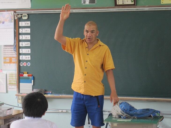 ALT(外国語指導助手)は、主に5・6年生の外国語活動の授業に参加しますが、今日は3・4年生の総合的な学習の時間に参加しました。ジェフ先生は、子どもたちにクリケットを教え、外国語をとおして、楽しく交流していました。この活動は、1・2年生でも実施します。ジェフ先生や外国語との交流をとおして、豊かな国際感覚を身に付けられるといいと思います。