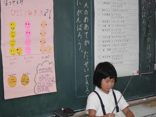 34日間の夏休みが終わり、今日は1学期残りの授業開始日です。たくさんの荷物(夏休みの課題等)を両手に持って、元気に学校に登校して来る様子が見られました。全校集会では、校長先生が「目標をもってがんばることの大切さ」「がんばっている人は周りの人に感動を与えること」を話されました。また、町内小学生水泳大会の入賞者の紹介、愛鳥作品コンクールの表彰も行われました。これからの1ヶ月は、運動会の練習が中心の学校生活となります。8月後半、9月は残暑の厳しい日々も予想されます。体調管理には十分気を付けたいです。
