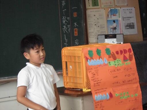 今日は2年担任の杉山教諭が出張のため、2年生の授業に入りました。5校時の生活科は5月に植えた野菜の成長を観察、記録する学習でした。「ナスがなっています。」「きゅうりの赤ちゃんができています。」など、野菜の成長を実感する声が多く聞かれました。その後、7人それぞれが自分の好きな野菜をスケッチし、教室で色を塗りました。これから気温の上昇とともに、スイカ、トマト、かぼちゃ、ししとうなどの野菜も大きく成長します。子どもたちの楽しみも増えることでしょう。