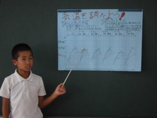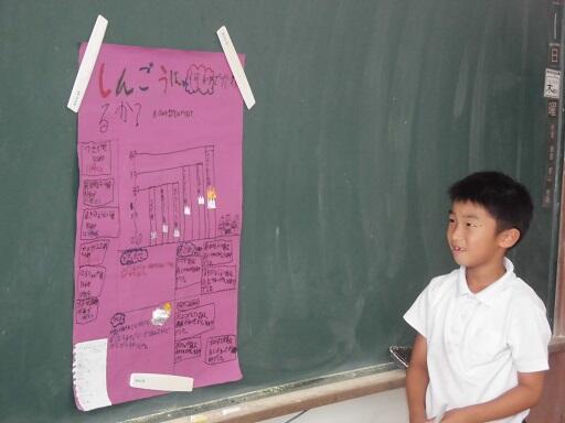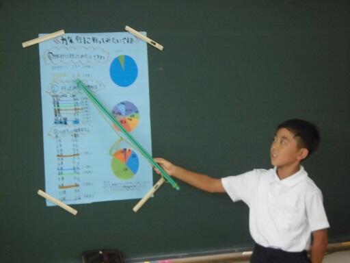 参観授業は子どもたち一人一人が夏休みの課題として取り組んだ「統計作品」の発表会でした。「将来の夢調べ」「気温の変化」「行ってみたい旅行先」など、テーマは一人一人違いますが、全員が棒グラフや折れ線グラフ、円グラフなど、調べたことをグラフ化し、分かったことをまとめています。本校は統計教育研究校に指定され、本年度は2年目を迎えています。昨年度の作品よりも、グラフ化が上手になったり自分の言葉でしっかりまとめていたりして、上達がうかがえました。保護者の皆様には作品作りで手伝いをしていただいたのではないかと思います。ありがとうございました。