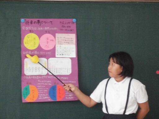 参観授業は子どもたち一人一人が夏休みの課題として取り組んだ「統計作品」の発表会でした。「将来の夢調べ」「気温の変化」「行ってみたい旅行先」など、テーマは一人一人違いますが、全員が棒グラフや折れ線グラフ、円グラフなど、調べたことをグラフ化し、分かったことをまとめています。本校は統計教育研究校に指定され、本年度は2年目を迎えています。昨年度の作品よりも、グラフ化が上手になったり自分の言葉でしっかりまとめていたりして、上達がうかがえました。保護者の皆様には作品作りで手伝いをしていただいたのではないかと思います。ありがとうございました。