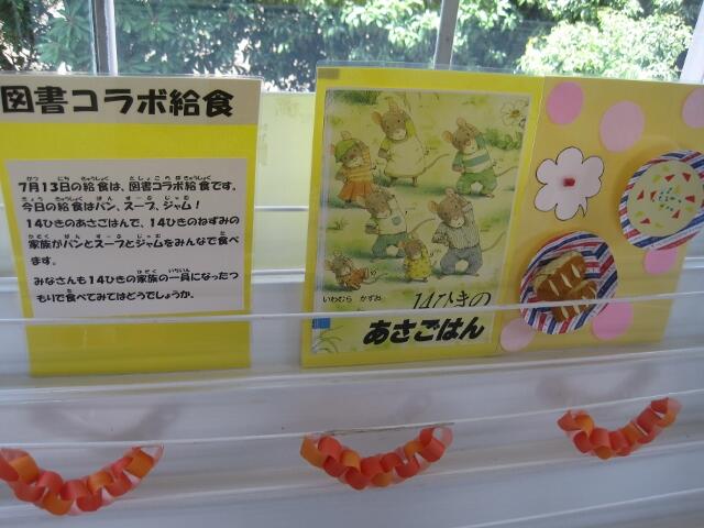 今日は図書コラボ給食で、「14ひきのあさごはん」という本に