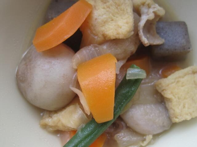 里芋以外にも、人参や厚揚げ、いんげんなどたくさんの食材が使われており、