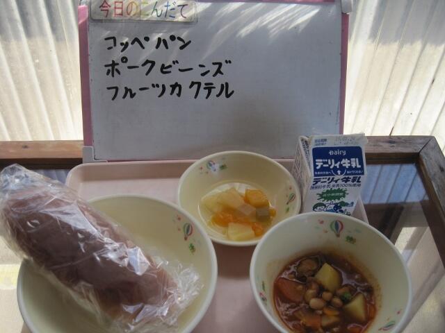 ポークビーンズがちょっと苦手な子も、フルーツカクテルを楽しみにして