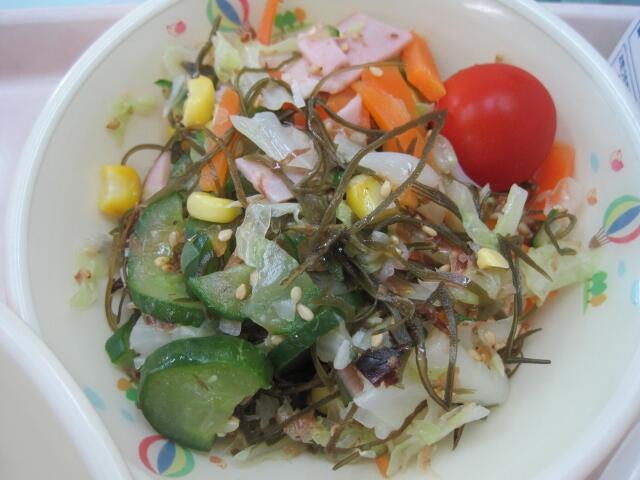 海藻サラダ・・・不足しがちな野菜や海藻類をたっぷり摂ることができます。学校給食では衛生管理のため、きゅうりなども湯がき、冷却したうえで調理しています。