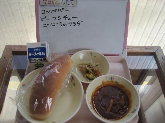 給食室から良い香りが漂っていた今日の献立は、ビーフシチューでした。