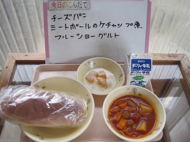 「今日はフルーツヨーグルト!」「やったーミートボール!」という