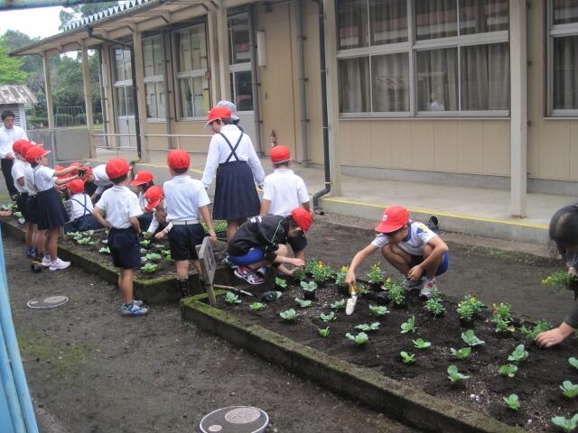 雨が降らない朝のうちに、学級園の花の苗植えをしました。