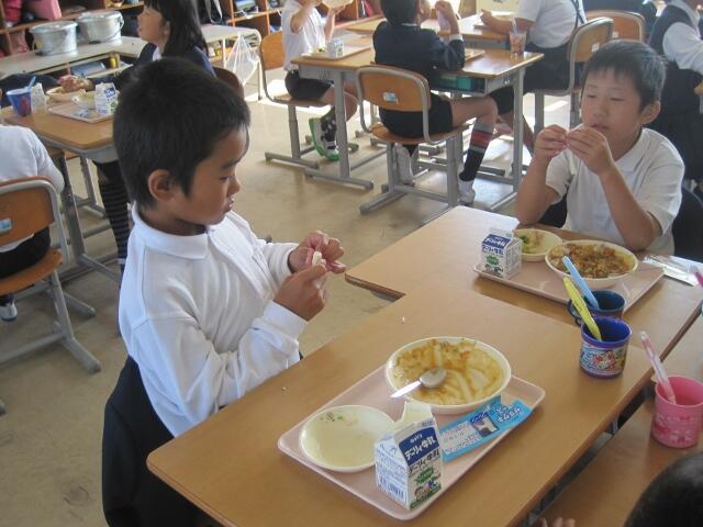 2年生教室では「卵は一人何個?」と数えながら、配膳していました。