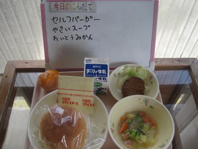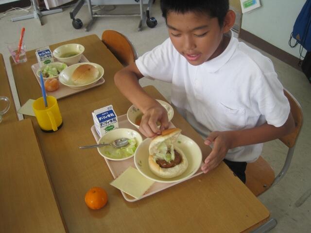 今日はハンバーグとキャベツをパンに挟んで食べる「セルフバーガー」でした。