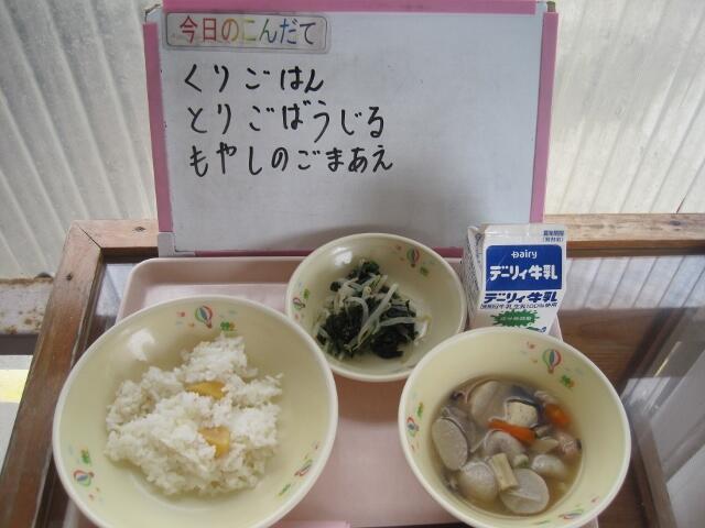 2学期初日の給食は、くりがたっぷり入ったご飯と、具だくさんの汁物で、