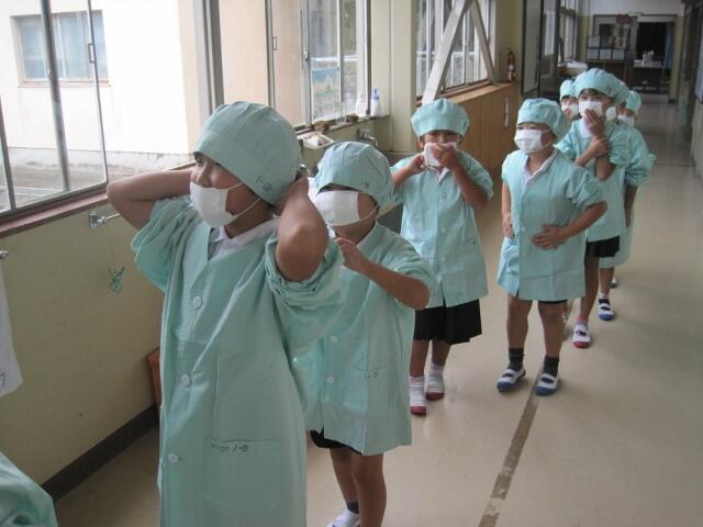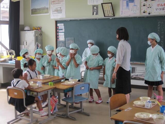 1年生は、初めての給食当番にドキドキワクワクしていました。