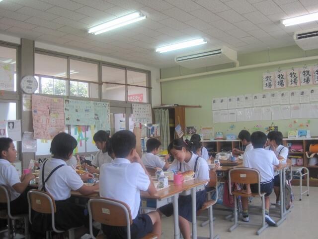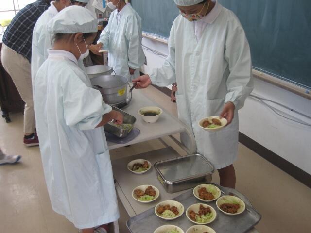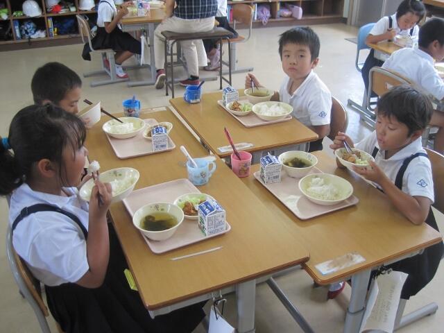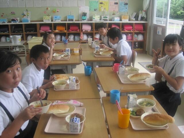 今日は担任の先生が出張のため、6年生と一緒に給食を食べました。