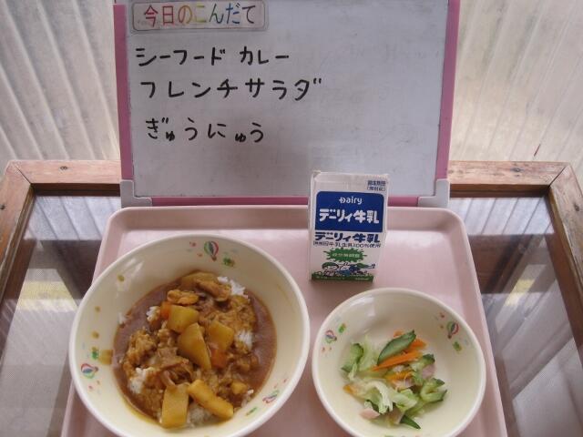 今日は、いかやむきえび、貝ばしらなどの具材が入ったシーフードカレーでした。