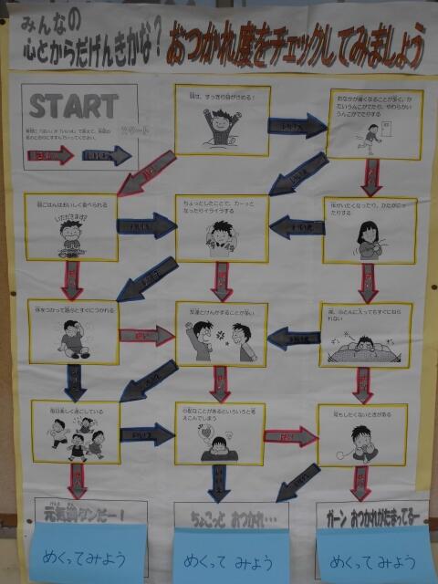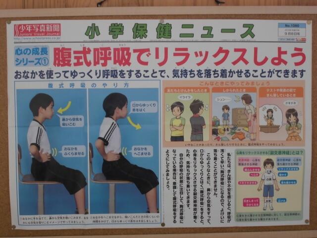 昨日16日(水)は欠席2名、遅刻及び早退は4名、体調不良及び怪我等での保健室来室が8名でした。15日(火)の予行練習や日々の運動会練習で子どもたちも少し疲れているのでは?。保健室前には、子どもたち向けに様々な掲示物があります。自分の疲れ度チェック、給食の食べ方、リラックスの仕方など、今の時期にぴったりのものばかりです。岩井養護教諭によると、「早寝早起き(規則正しい生活)」「バランスの良い食事」が大事ということです。運動会まで残すところ1週間あまりです。シルバーウィークを活用して、心も体も回復したいですね。ご家庭でもご指導よろしくお願いします。