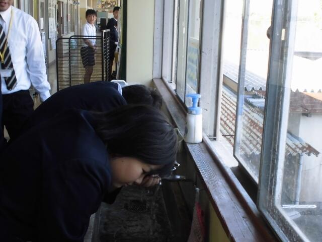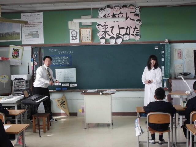 6年生の学級活動「目を大切にしよう」の授業が学級担任と養護教諭の2人で行われました。授業の進行やめあて・まとめは学級担任、目の病気の専門的な知識について養護教諭が担当し授業を進めました。授業の最後には、予防方法の一つである「目を洗う」を実際に手洗い場で実践しました。これからインフルエンザ等が流行る時期です。病気の予防という観点から、手洗い・うがいなど体の衛生には特に気を付けていきたいです。