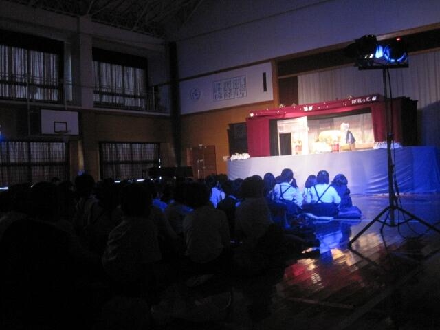 午後から狭野小の児童と一緒に参加する鑑賞教室に行きました。真っ暗な体育館に人形劇の舞台が設置され、幻想的な雰囲気の中で劇が始まりました。演題は「かさじぞう」です。人形を操作する人は、たったの3人。たくさんの人形を操り、まるで生きているかのようでした。劇終了後は、舞台の裏を見学し、人形の操り方や小道具、大道具を実際に触っていました。本物の芸術に触れる貴重な機会となりました。