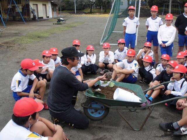 秋本番です。今日は1・2年生、5・6年生が芋ほりをしました。はじめに、芋畑一面に茂った雑草を取り除きました。その後、芋のつるを見つけ、友達と協力して芋を大事に掘っていました。赤い色の芋を見つけるごとに「あった!」「大きい!」など歓声を上げ、みんな楽しく活動していました。大量の収穫で、一人当たり3個ずつ持ち帰りました。畝作り、マルチ張り、苗の準備等、PTA会長の福永様には大変お世話になりました。ありがとうございました。
