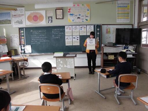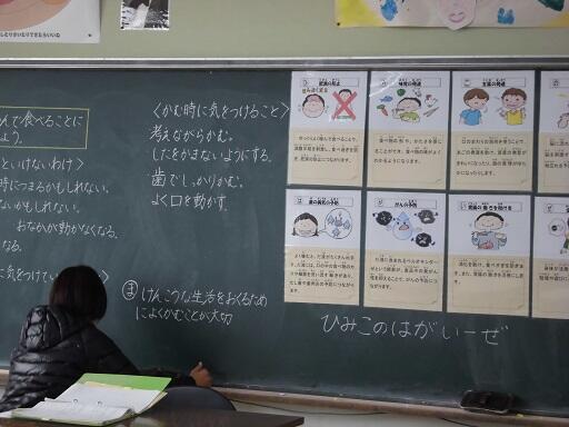 3年担任の小路教諭と岩井養護教諭がティームティーチングで学級活動の授業を行いました。主題は「よくかんで食べよう」です。子どもたちに普段の食生活を振り返らせて、「なぜ、よくかむ必要があるのか」を考えさせました。岩井養護教諭が「ひみこのはがいーぜ」というキーワードを提示し、「『ひ』は肥満防止、『み』は味覚の発達、『こ』は言葉の発達、『の』は脳の発達、『は』は歯の病気予防、『が』は癌の予防、『いー』胃腸への負担軽減、『ぜ』は全力で生活」を資料を活用して説明しました。子どもたちは、説明を聞いた後、これからの食生活について一人一人目標を設定し今日の給食から実践しました。成長期のこの時期に貴重な授業となりました。