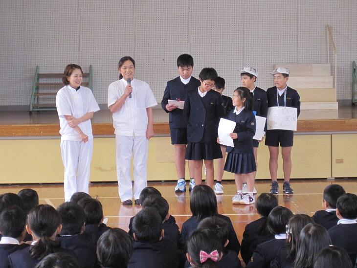 今週は給食感謝週間です。今日の業間に給食集会がありました。調理員の内田先生と中窪先生にも参加していただき、子どもたちからの感謝の手紙の贈呈、調理員へのインタビュー、調理員からの話がありました。また、給食時間は1年生と5年生、調理員の2人、校長先生を交えて交流給食がありました。それぞれのグループで楽しい交流ができました。明日は2・4年、明後日は3・6年の交流給食が実施されます。