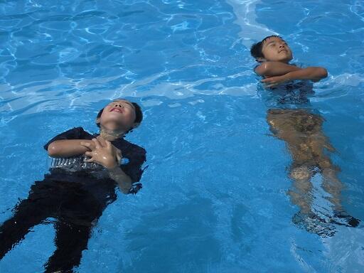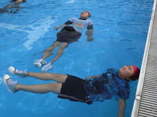 今日は全学年、着衣泳の学習をしました。これは文字どおり服を着たまま泳ぐ学習です。これから家族で海や川に行く機会もあると思います。思わず水に入り、そのまま水に流されることも予想されます。そんなときにどうすればいいかを実際に体験して学んでいきました。ペットボトル1~2本で浮くことができることに子どもたちも驚いていました。命を守る貴重な学習ができました。
