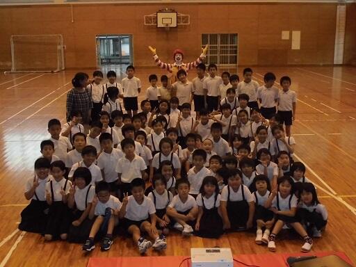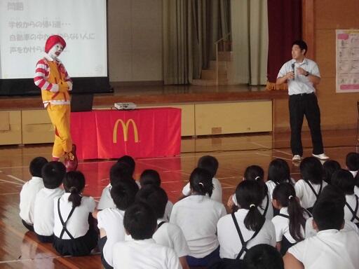 5校時にマクドナルドのキャラクターであるドナルドと職員を迎えての防犯教室がありました。「こんな時どうするの?」というテーマで、不審者役に杉山先生がなり、児童の代表と場面を設定して対応を演技しました。「相手の話に乗らない。」「相手との距離を保つ。」「だめだと思ったら逃げる。」の3つを学びました。友達や職員が演じたことで、子どもたちも身近な場面を想定しながら考えていたようです。もうすぐ夏休みです。「自分の命は自分で守る。」ことを常に考えて行動できるように御家庭でもご指導ください。