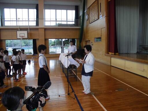 3月の終わりに校区内のお住まいの今西岱子様から、広原小に図書購入の寄付金をいただきました。これは、夫である故今西光正の願いを妻の岱子様が引き継いだものです。4月より、全校児童に読んでみたい本を選んでもらい、7月になってようやく本が学校に届きました。今日は、その本の贈呈式でした。今西岱子様、教育長の江田正和様をお迎えし、全校児童参加で贈呈式を行いました。今西様からは「本を大事にたくさん読んでください。」と、子どもたちに呼びかけられました。児童を代表して、6年生の今西洸樹喜君が感謝の言葉を述べました。この本は「今西文庫」として大切に管理し、たくさんの子どもたちに読んでもらいます。今西様、本当にありがとうございました。