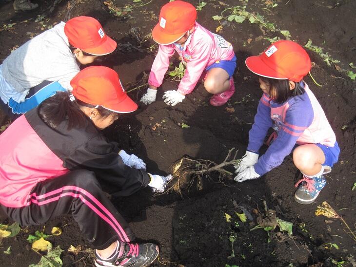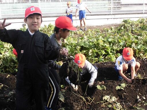 いもの収穫をしました。上級生がいものつるを切り、いよいよ収穫です。一本のつるに3~4個の芋がなり、大量のいもが収穫できました。途中で折れないように、いもの周りを丁寧に掘っていく子ども、鈴なりのいもを持ち上げて喜ぶ子ども、下級生のお世話をしながら掘ってあげる子ども、子どもたち一人一人が楽しく活動できました。掘ったいもは子どもたちに持ち帰ってもらう予定です。是非、ご家庭で味わってみてはいかがでしょうか。4月に畑を耕していただいた久保宮さん、苗を提供してくださった福永さん、ありがとうございました。