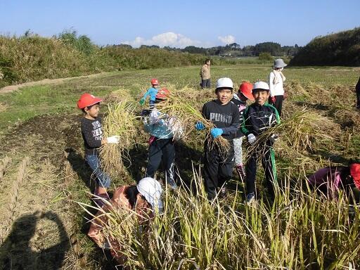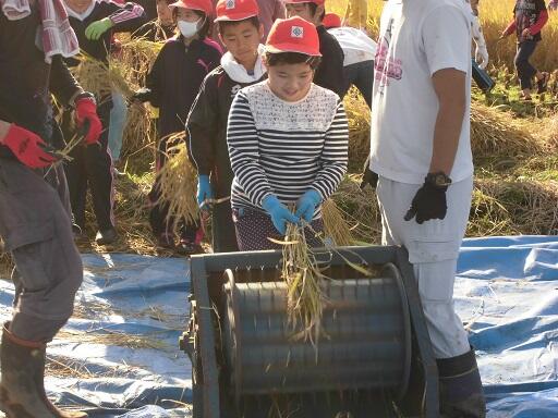 秋晴れの空の下、広っ子田んぼの稲刈りを実施しました。昨日までの雨の影響で、少しぬかるんでいた田んぼですが、子どもたちは楽しく活動できたようです。昔の脱穀機の足踏み脱穀機で貴重な体験もできました。このように子どもたちが収穫できるのも、これまで水の管理や雑草の除草など、広原営農組合の方々、PTA事業部の保護者の方々の協力があったからと思います。ありがとうございます。今後、収穫した米は精米し12月の交流もちつきで食べます。地域の方々や保護者の方々にも販売する予定ですので、どうぞ楽しみにしていてください。