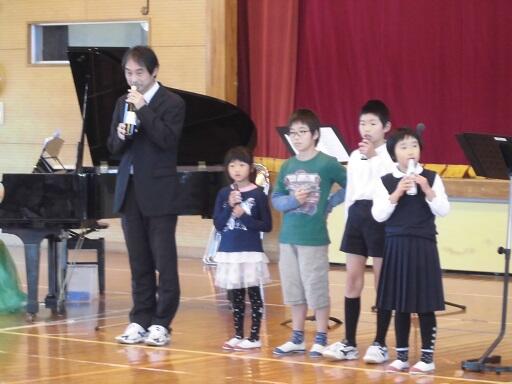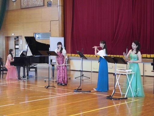狭野小と広原小合同の鑑賞教室がありました。フルートとピアノそれぞれ2人ずつの演奏者を迎え、曲を聞いたり楽器を演奏したり一緒に歌ったりして、およそ1時間、きれいな音楽に触れることができました。子どもたちは目をキラキラさせながら演奏を聴いていました。きれいな音楽は心も体も大変リラックスできます。子どもたちにとっても私たち職員にとっても貴重な時間を過ごすことができました。