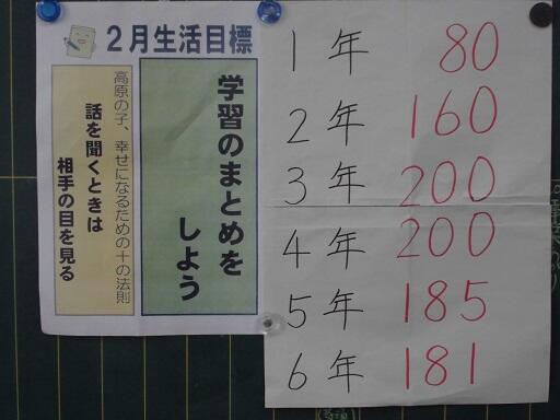 早いもので今日から2月です。業間の時間に全校集会がありました。阪元校長が「2月はなぜ28日までしかないのでしょう。」と子どもたちに問いかけられました。答えは「古代ローマ帝国の作物作りに合わせて作られた暦と1年間の日数の関係で2月が28日になった。」とのことでした。阪元校長は「身近にある不思議なことに興味をもって自分の力で調べていくことが大切です。」と話をされました。その後、今月の目標について小路先生がある数(右の写真)を示しました。この数は各学年で学習する漢字の数です。今月の目標は「学習のまとめをしよう」です。現在の学年までに学習したことをしっかり身に付けて次の学年に上がれるように授業をさらに充実していきたいと思います。