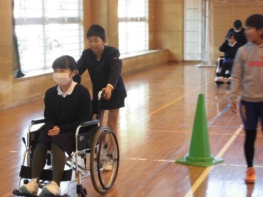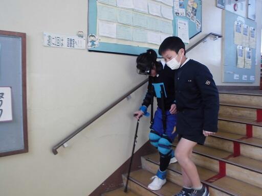 総合的な学習の時間で5年生が福祉体験学習に取り組みました。車椅子体験、体の不自由さの疑似体験、アイマスク体験の3つです。体の不自由さの疑似体験では、手足に4つの重り、腰が曲がる装具、焦点がぼやけるゴーグルを付けました。視界が見えづらかったり階段が上りにくかったり、不自由さが体験をとおして実感できたようです。このような体験から、障がいのある方や高齢者の方々に対して自分たちが何ができるのかを考え実践していきます。