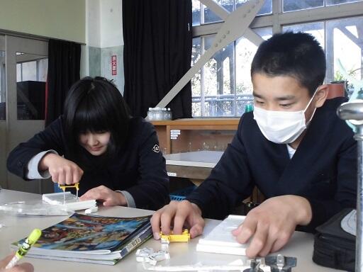 3年生が理科室で理科「ものの重さ」の学習をしています。めあて「ものの形によって重さが変わるのだろうか。」のもと、子どもたちは25gの粘土を量り、粘土の形を変えてもう一度天秤にのせていました。3~4人のグループで協力して実験に取り組めました。実験に取り組む子どもたちの目は輝いていました。