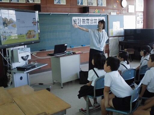 今年で3回目となります統計教育出前授業がありました。県統計調査課から2人を講師に迎え、1~3年生、4~6年生の2つのグループで出前授業を受けました。調べたデータをグラフにすることを、それぞれの学年に応じてわかりやすく説明してもらいました。この出前授業を受け、夏休みの課題として「統計グラフ作品」を作ります。子どもだけでは難しいこともあるかもしれません。保護者の皆様の協力をよろしくお願いします。昨年の作品は小学校の玄関に飾っていますので参考にされてください。
