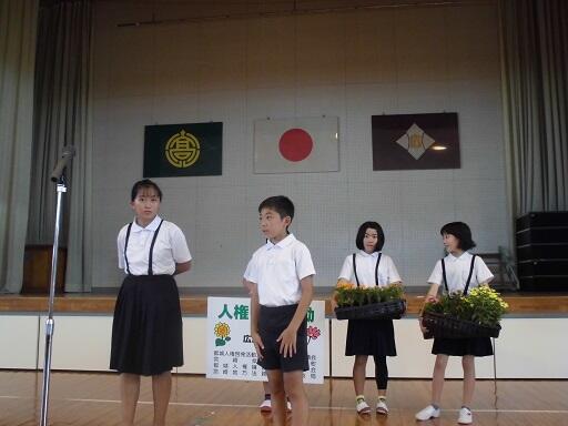 人権啓発活動の一環として、本校が「人権の花運動」の指定を受けました。これは友達と一緒に花を栽培することで、命の大切さや友達への思いやりを身に付けることがねらいとなっています。今日は、横山副町長、法務局の方々、人権擁護委員の方々を迎え、「人権の花贈呈式」を実施しました。花や看板を受け取った6年生の末山翔君と真方優衣さんは「優しい心で大切に育てます。」と決意表明しました。いただいた花苗はプランターや花壇に植え、育てていきたいと思います。