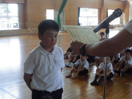 1学期前半最終日を迎えました。全校集会で校長先生から「4つの車のお世話にならないように」という話がありました。消防車、救急車、パトカー、不審な車のことです。夏休みは、全国各地で「命」をなくす事件事故が多い時期です。夏休みのきまりをしっかり守って、有意義な休みにしてほしいと思います。また、歯と口の健康週間の標語募集で3年の原田怜歩君が県入賞を果たし表彰を受けました。
