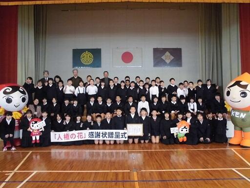 昨年7月に「人権の花」贈呈式を行い、およそ半年、それぞれの学級でいただいた花を育ててきました。今日は高原町、都城法務局、人権擁護委員の方を迎えて、感謝状贈呈式がありました。6年生の水町大河君が児童代表で感謝状を受け取りました。また、荒殿麻緒さんが、花を育てた経験をもとに人権についての考えを発表しました。「人権の花」やサイネリアの栽培を通して、命の大切さや人を思いやる気持ちを一層高めてほしいと思います。