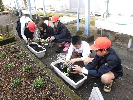 今日の清掃時に「人権の花」の植え替えをしました。黄、紫、白それぞれの色のパンジーをプランターに植えました。また、駐車場の学校の花壇にもパンジーに加えビオラも植え、大変華やかになりました。子どもたちが植えた「人権の花」は、これから大切に育て、卒業式を飾る予定です。来校の際は是非ご覧ください。