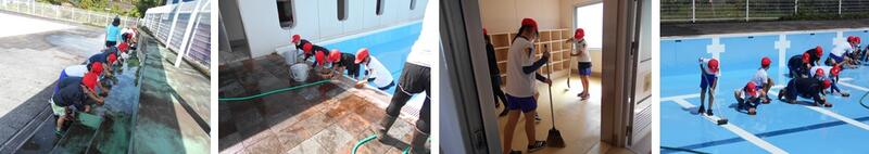プール清掃を行いました。全校のみんなで行いました。プールサイドのベンチ、小プール、更衣室、大プールを分担して行いました。たわしでこするとどんどんきれいになりました。少し水がかかるのが楽しくて、気持ちよかったです。6月13日(月)のプール開きが待ち遠しいです。