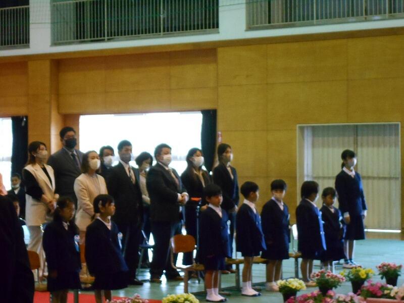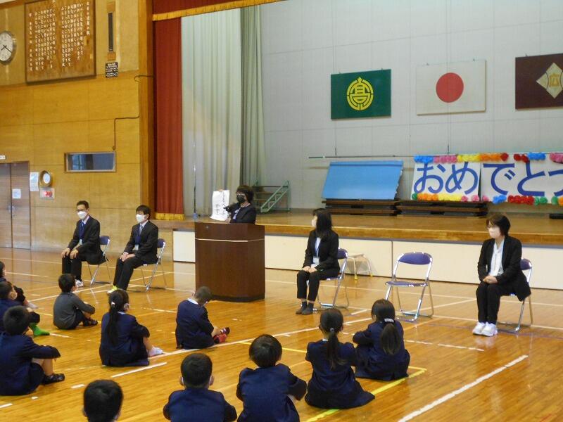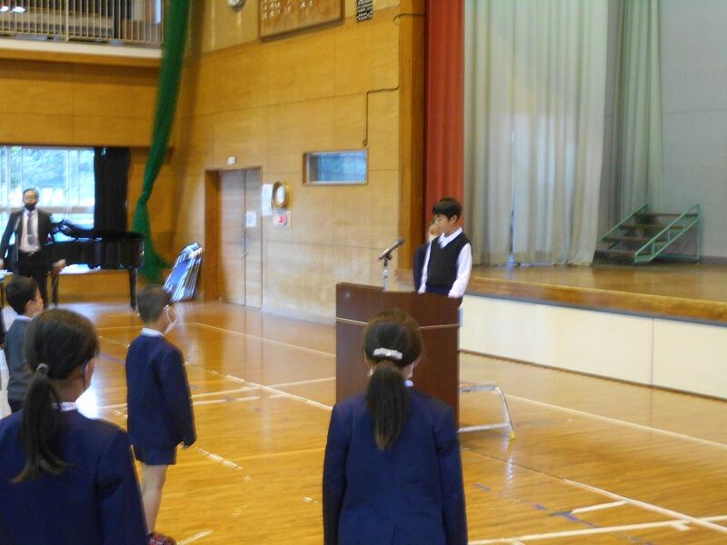 4月7日、ひさしぶりの学校で、子どもたちもちょっとそわそわしている中、新任式がありました。本年度来られた5名の先生方が紹介され、それぞれの挨拶がありました。その後、校長先生より担任の先生の発表がありました。始業式では、2年生と5年生の代表の子どもたちが、今年の目標を発表しました。2年生の末山君は、「字を丁寧にかくこと」「算数をがんばること」「お手伝いを進んですること」を発表しました。