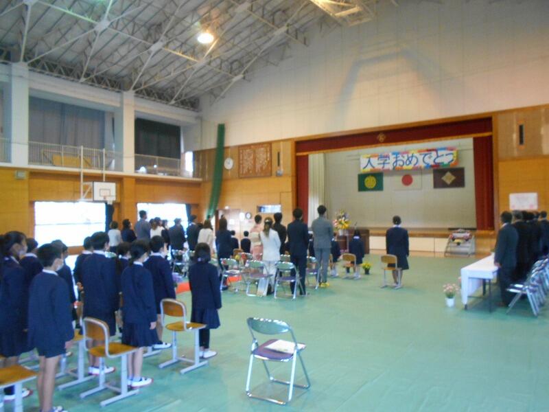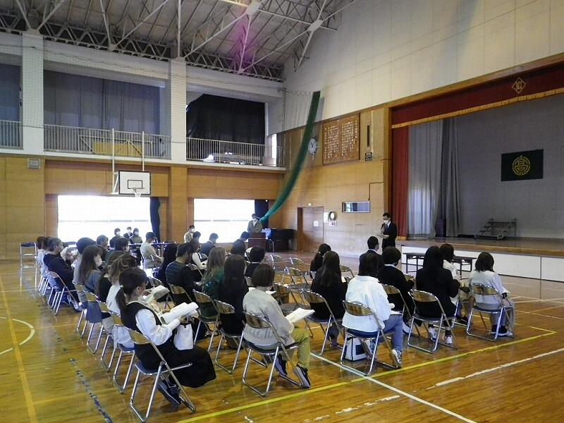 4月12日 本日、入学式がありました。9名の真新しい制服を着た、1年生が、体育館に担任の引率で入ってきました。在校生と、来賓・保護者の皆様方に見守られながら、担任の先生による氏名点呼では、元気よく挨拶ができていました。式の終了後は、集合写真を撮り、1年教室で、これからのことについての話がありました。帰る時の1年生のキラキラした笑顔が印象的でした。