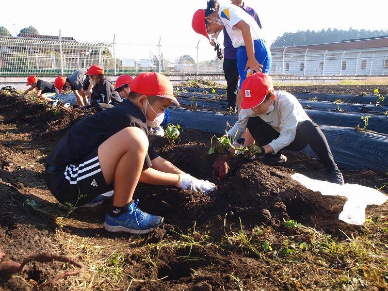 収穫の秋です。10月20日、23日に、いもの収穫を行いました。切ったつるの下を掘ってみると、大きいのがゴロゴロ出てきました。子どもたちの間から「 収穫の秋です。10月20日、23日に、いもの収穫を行いました。切ったつるの下を掘ってみると、大きいのがゴロゴロ出てきました。子どもたちの間から「おおっ」と歓声があがりました。立派ないもがたくさん収穫できました。