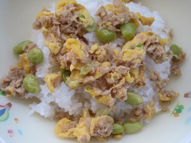 今日は、まぐろのみずに、たまご、えだまめできれいな三色丼でした。