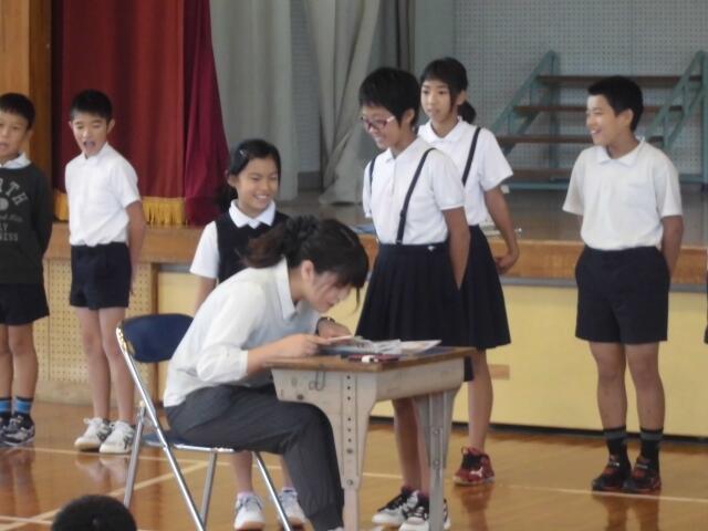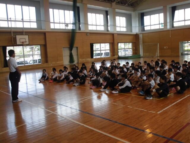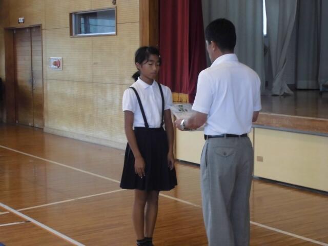 早いもので今日から10月、今年度も半分終わりました。今日は全校朝会で今月の月目標のお話がありました。今月の目標は「目を大切にしよう」です。4年生以上の保健給食委員会の児童と養護教諭の岩井先生が本を読む姿勢や勉強する姿勢など、悪い例を交えながら全校児童に実践内容を伝えていました。また、5月に行われた新体力テストで体力賞(判定A)の児童の表彰もありました。代表で6年生の久保宮未悠さんが証書を受け取りました。