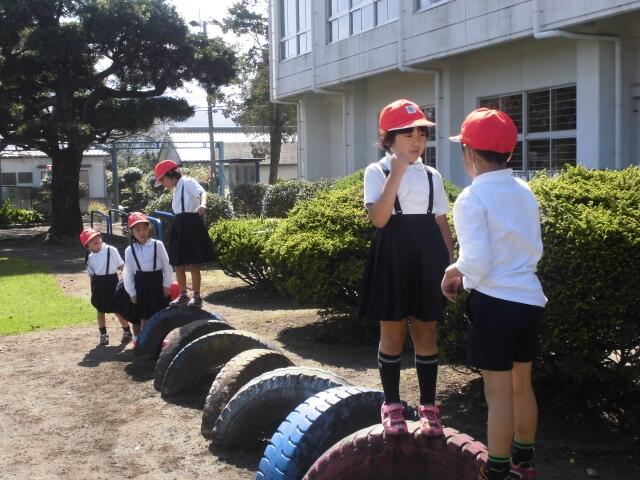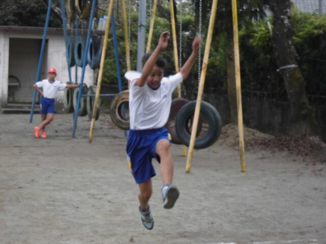 朝夕はめっきり涼しいというより肌寒い日が続いています。彼岸花も花びらを落とし、本格的な秋を感じさせる今日この頃です。運動会が終わって10日あまり、子どもたちは大変元気です。昼休みには、1・2年生のブランコの争奪戦が始まっていました。「誰の靴が一番飛ぶかな?」と問いかけてみたところ、子どもたちは必死に靴を飛ばしていましたが、なかなか飛びません。私が子どもの頃はよくやった遊びですが、今の子どもたちには難しいのかなと思いました。体育館横のタイヤではじゃんけんタイヤ跳びで遊びました。数回挑戦していくうちに汗が流れました。日中はまだまだ暑いです。1学期も残すところ3日です。最後まで体調崩すことなく楽しい学校生活を送ってもらいたいと思います。