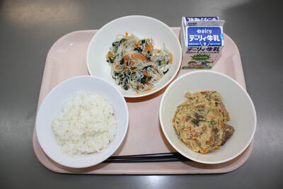 【1/23(月)】「復興宮崎応援給食」麦ごはん、牛肉の卵とじ、ちりめんの和え物